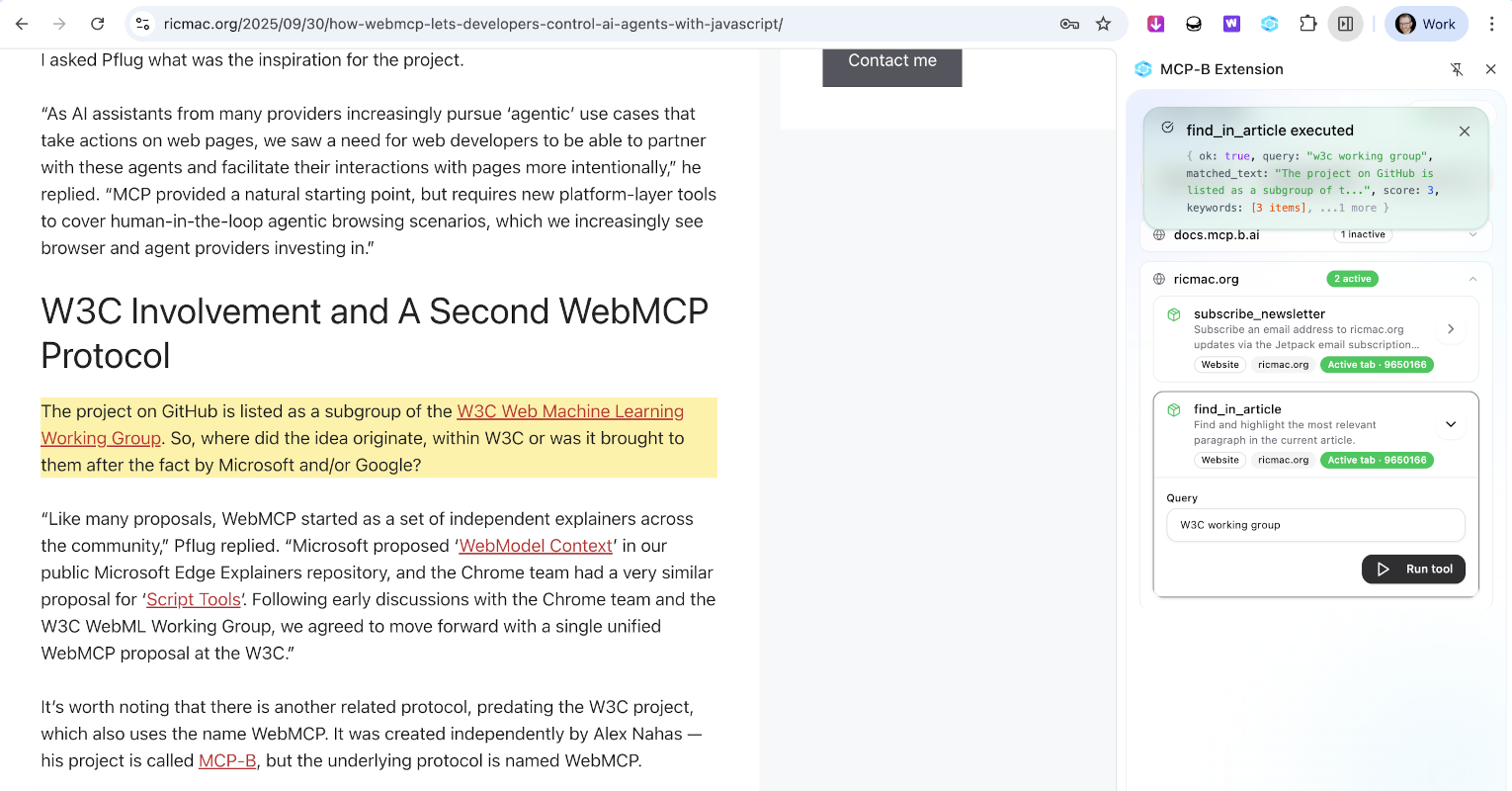 If you have the MCP-B browser extension installed and/or you have Chrome Canary, do test this WebMCP functionality on my website. I’d love your feedback, so please leave a comment on this post or tag me on Mastodon, Bluesky or LinkedIn.