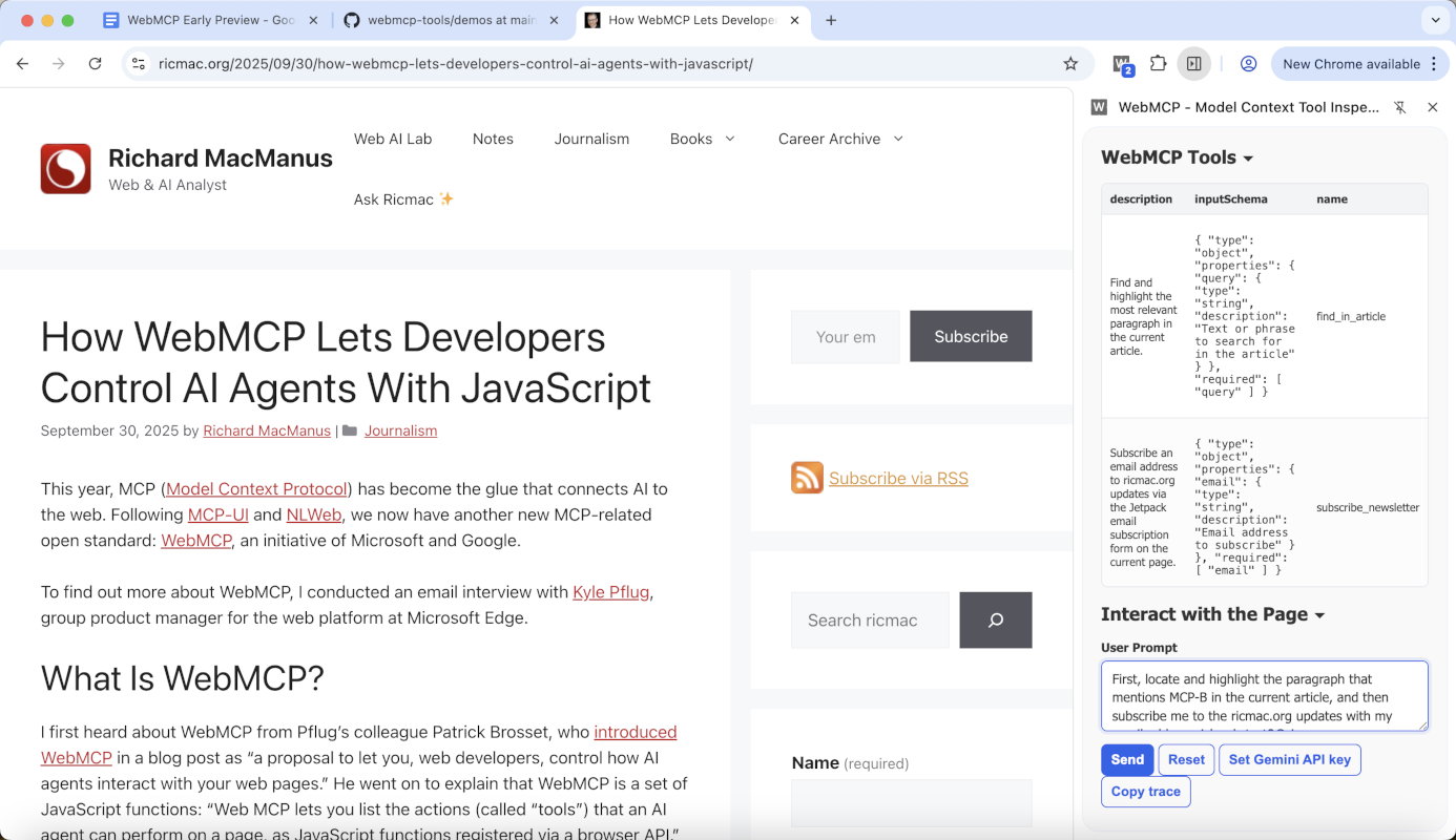 I chose those two use cases because they would show off the ability of WebMCP to take browser actions on my website. This is different to how my Ask Ricmac chatbot works, which is by calling an MCP server running in Cloudflare Workers — in other words, the AI functionality runs in the server and is sent back to my website. But with WebMCP, an agent can interact with the website itself, in the browser, in order to accomplish a task: in this case, subscribing to my site via email and/or searching an open article.