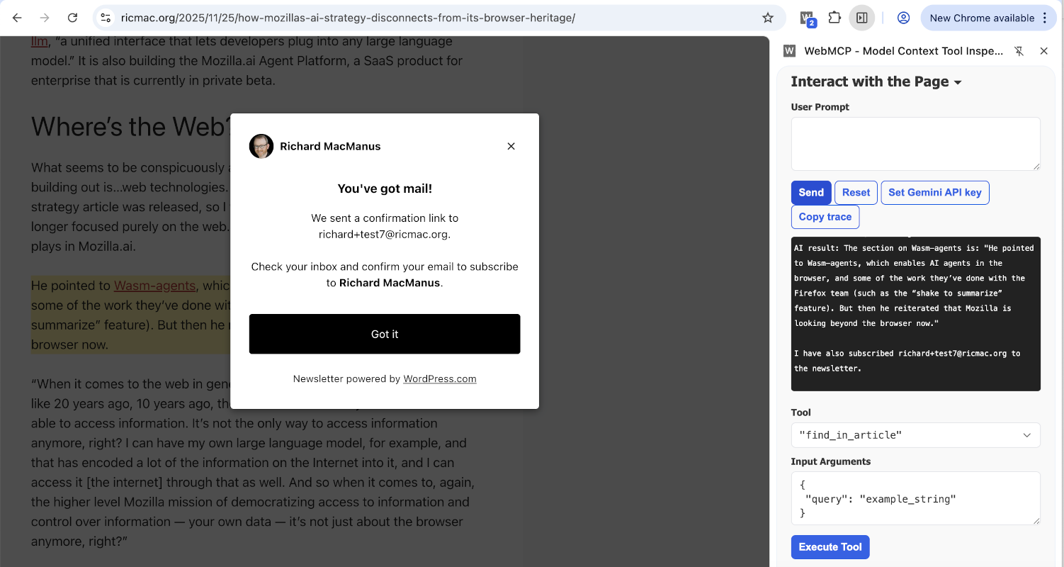 For my ricmac.org prototype, I reused the same two tools — email subscription and article search — and tested them inside Chrome Canary with WebMCP enabled.